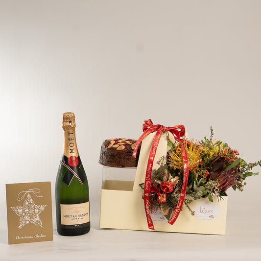 Christmas Cake Moet and Natives Flowers Box